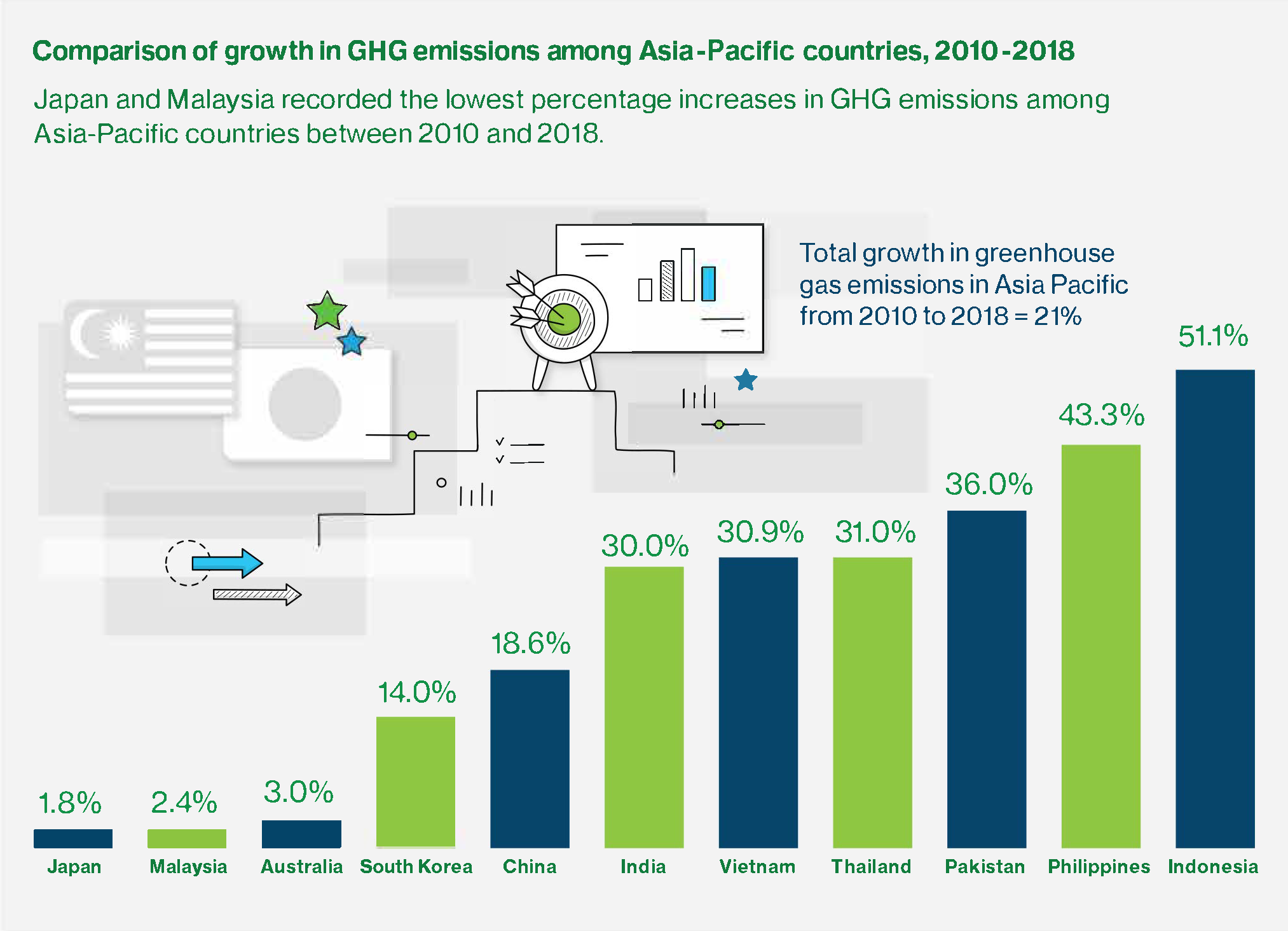 Отвечая на растущую срочность проблемы, страны и города региона активизировали долгосрочные обязательства по сокращению выбросов и внедрению целей в области экологии, социальной ответственности и корпоративного управления (ESG) в свои стратегические решения и бизнес-процессы. Среди них Большой Куала-Лумпур — один из наиболее быстрорастущих городских центров Юго-Восточной Азии, а также Малайзия в целом — пообещали достичь углеродной нейтральности к 2050 году. Это одно из самых амбициозных планов по декарбонизации в регионе.